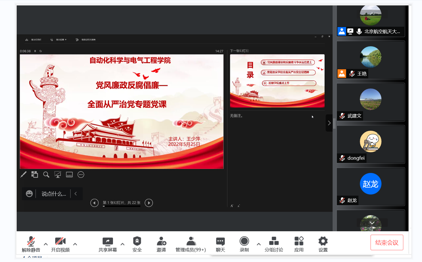 2022年5月25日正规滚球app平台官网党委书记王少萍做了“从严治党暨党风廉政建设”专题党课。会议以线上腾讯视频会议方式进行,学院全体教职工参加了本次集体学习活动。