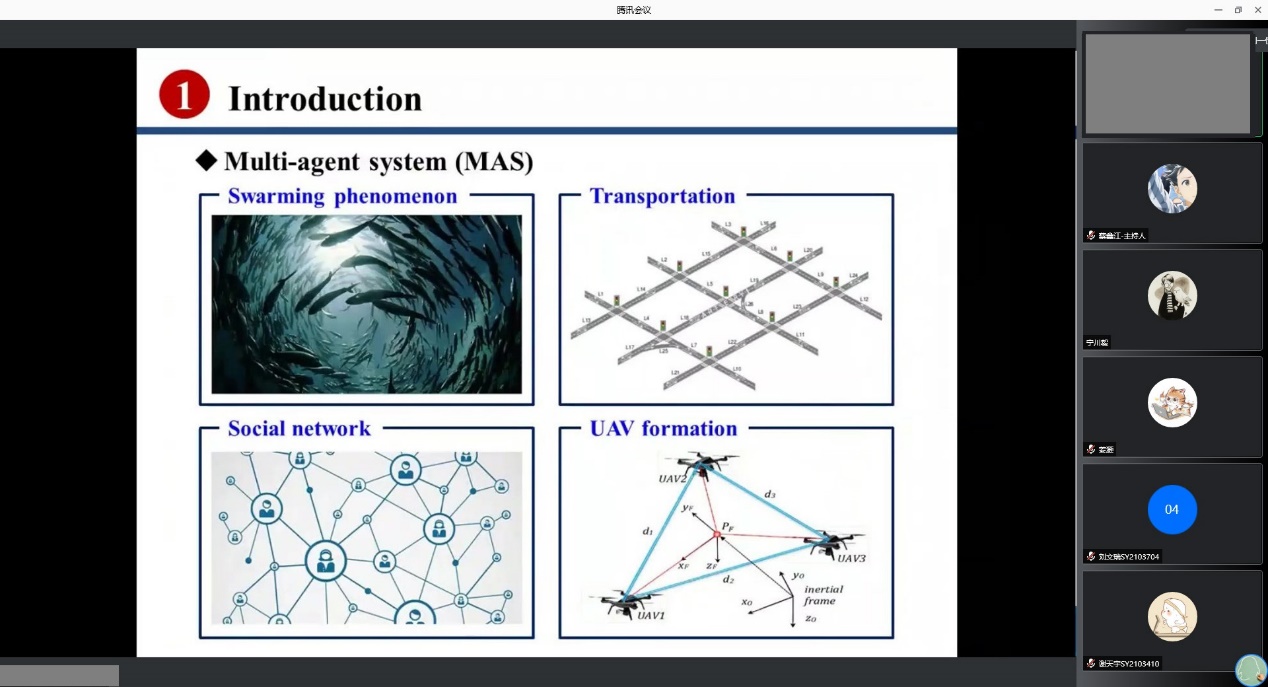 接下来进行分享的是正规滚球app平台官网2018级博士生张璟尧同学。他以“非线性多智能体网络系统在切换拓扑下的分布式迭代学习控制”为题,整合其发表在AUTOMATICA和IEEE TAC上的两篇论文研究内容进行汇报。张璟尧同学首先简要介绍了迭代学习控制的基本原理与优缺点,并以行进乐队为例,对迭代学习控制的对象——多智能体系统的相关特点与控制目标进行了阐述。随后引入代数图论、联合生成树等知识,设计分布式迭代学习控制协议,将全局Lipschitz条件放松为局部Lipschitz条件,通过理论推导、数值仿真等手段,回答了在具有切换拓扑的非线性多智能体网络系统中如何实现分布式迭代学习控制这一问题。