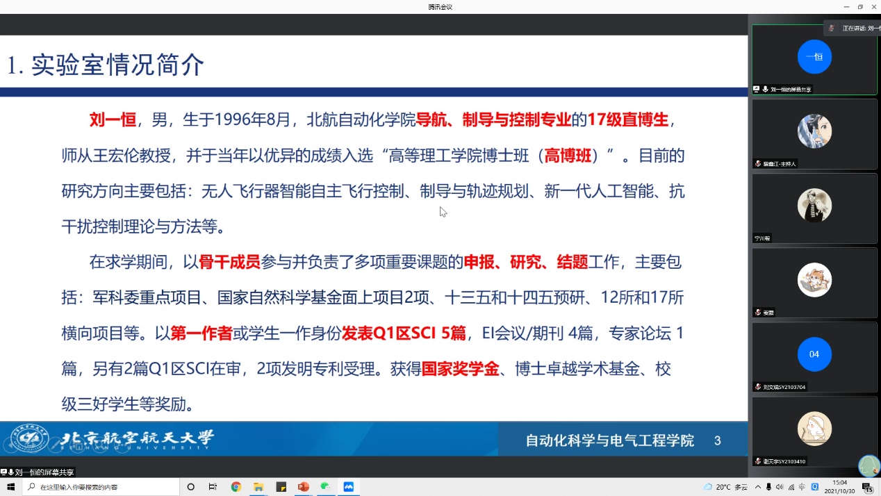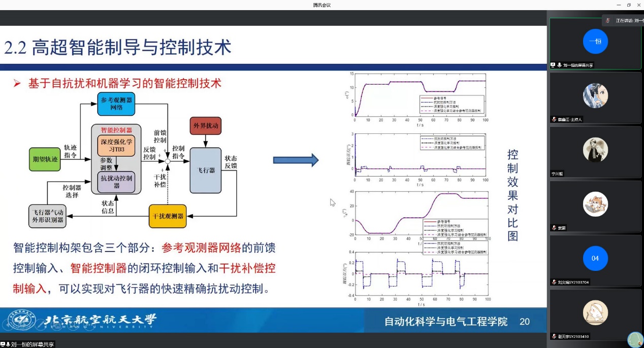刘一恒同学是正规滚球app平台官网2017级博士研究生,师从王宏伦教授。汇报开始,刘一恒同学简要介绍了个人信息与课题组概况,随后围绕“无人机软式空中对接与回收抗扰动快速精准控制技术研究”,从“无人机空中对接与回收控制”、“高超智能制导与控制技术”、“无人机自主空中加油对接控制技术”、“飞行器空中态势感知与自主避撞技术”、“运载火箭上面级智能在线重规划技术”五个方面展开介绍,明确阐述了研究工作的重要性与难点,并通过大量图表、仿真结果、实验结果,直观地展示了其在博士期间丰富的科研成果。最后,刘一恒同学分享了自己在多年科研生活中总结出的宝贵经验,强调了明确研究方向、提前做好未来发展规划的重要性,分析了项目与科研的互补作用,也叮嘱大家要注意身体、健康生活。