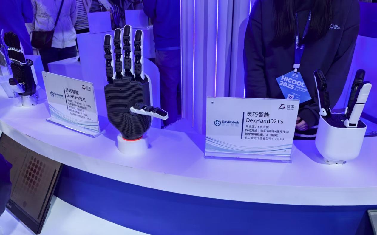 随后,企业展区的产品展示让同学们更直观地接触产业实践,清晰感知当前科技领域的研究热点与成果转化水平。其中,他山科技带来的机器触觉与灵巧手项目引发同学们广泛关注。该项目中的触觉传感器具备高精度三维力实时感知、多触觉传感单元动态协同感知性能,展出的灵巧手自由度涵盖8至22种,拥有多种形态设计。同学们通过近距离观察、体验产品,进一步激发了对自身未来研究方向的探索思路。