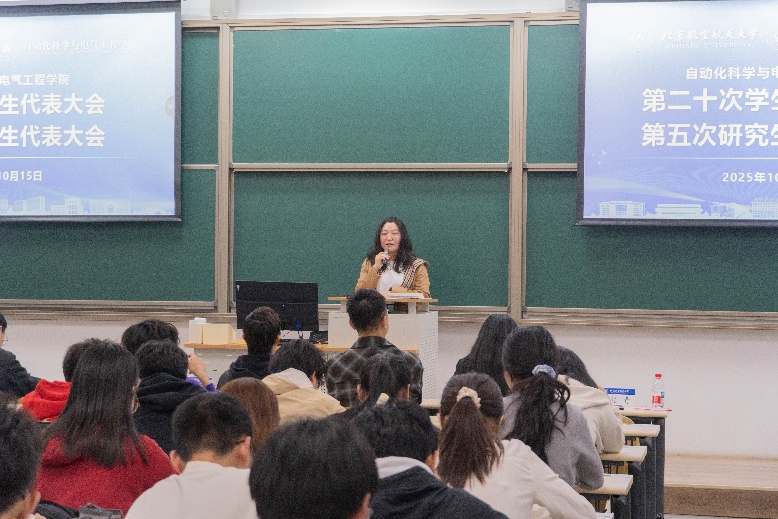 学院团委书记乔娇代表学院团委对大会的召开表示热烈祝贺,并向过去一年学生会成员的出色工作与辛勤付出致以诚挚感谢。乔娇对新一届学生骨干提出殷切希望:一是要当好感知同学需求的“传感器”,深入同学、倾听心声;二是要脚踏实地,多干实事,聚焦学术、就业等真实需求,以解决实际问题赢得“同学们口碑”这枚最硬的勋章;三是要不忘初心,运用自动化领域的反馈闭环思想优化工作流程,确保事事有回应、件件有着落,同时强调学院团委将是大家坚实的后盾,共同建设好自动化家园。最后,她勉励全体学生代表携手共进,在新征程中书写无愧于时代的青春华章。