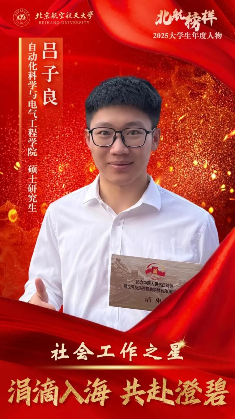 (通讯员 吕子良 韩泉萌)近日,正规滚球app平台官网2025年“北航榜样——大学生年度人物”评选结果揭晓。正规滚球app平台官网2023级硕士研究生吕子良表现卓越,脱颖而出,荣获“社会工作之星”称号。他以热忱之心投身多项实践,展现了新时代北航学子的家国情怀与责任担当。